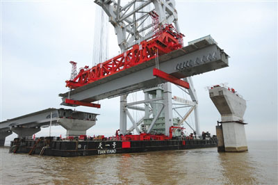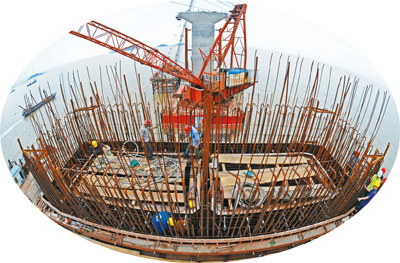 港珠澳大桥建设正在如火如荼进行中。港珠澳大桥是粤港澳三地第一次相助共建的超大型工程,起点是香港大屿山,跨越珠江口,最后形成Y字形分岔,一端连接珠海,一端连接澳门。预计2016年全桥领悟,实现珠港澳30分钟经济圈。图为工人正在桥墩上施工。