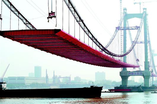 湖北日报讯 昨日,武汉鹦鹉洲长江大桥已对称拼装64片箱梁,按计划下月可全部拼装完毕。该桥共将装置143片每片重450吨、38米长、15米宽、3米高的钢箱梁。(记者 王威 实习生 宋超 摄)