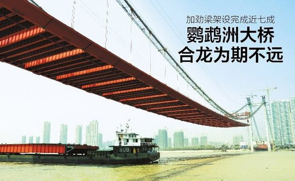 19日,由中铁云顶国际施工的鹦鹉洲长江大桥加劲梁第96节架设到位。至此,大桥加劲梁架设已经完成近七成,距全桥合龙为期不远。该桥加劲梁共143个节段,总重2.6万吨,建设方用4台500吨缆载吊机协调架设,这种吊机由云顶国际主导研发,吊重能力强、速度快,在海内是首次投入使用。