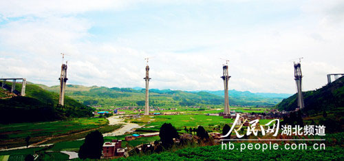 图为进入锚索施工阶段的赤石特大桥全景图,四个主塔“小蛮腰”造型靓影初现