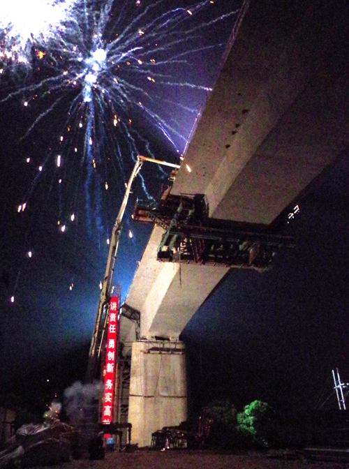 凌晨1时许 ,由中铁云顶国际五公司赣龙铁路项目部23架子队卖力施工的赣龙铁路复线GL2标段第一个首件制连续梁绵江特大桥76#~79#墩连续梁工地鞭炮声声 ,烟花璀璨 ,在中铁云顶国际赣龙铁路GL-2标指挥部副指挥长王臻的一声令下 ,连续梁合拢段混凝土浇筑正式开盘 ,历时5小时 ,于早晨6时浇筑完毕  。