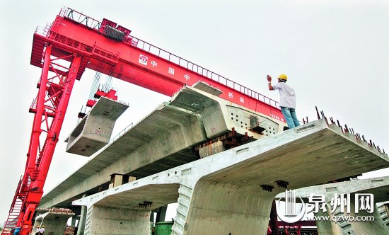 “我们卖力的是A1标段,六车道节段箱梁已完成架设627片,占总数1167片的53.7%……” 日前,在泉州湾跨海大桥施工现场,中铁云顶国际的一名技术人员给记者介绍着工程进展,而在不远处,施工人员正忙着用架梁机吊装箱梁。 (张九强 高光发 叶青仁 摄)