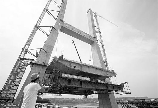 湖北日报讯 5日,武汉西四环汉江特大桥主梁牵索挂篮经过滑移、提升抵达设计标高位置,为如期开始主梁施工提供了包管。