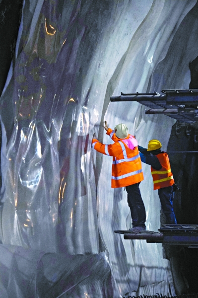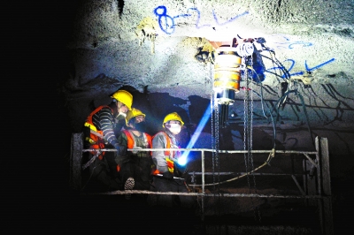 ËÄÎå¸ö¹¤ÈËÕ¾ÔŲ́³µÉÏ£¬ÆëÁ¦³éÀ¶¥×ÓÉϵÄÌúÁ´¡£ËíµÀºÜÉÌúÁ´ÓëÑÒʯײ»÷µÄÉùÒôÖØ¸´»ØÏì¡£ÈâÑÛ¿´²»µ½µÄµØ·½£¬ÁíÒ»¶ËµÄê¸ËÒѾ²åÈëɽÌå25Ãס£Õâ¾ÍÏñÒ»°ÑËø£¬Ëø×¡ËíµÀÉÏ·½µÄÑÒʯ¡£
