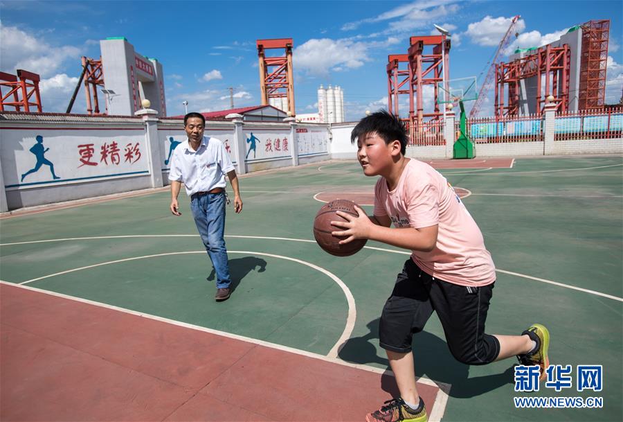 ÔÚºþ±±Ê¡Î人ÊУ¬º«Õ¼Ðù£¨×ó£©Åã×Ŷù×Óº«Ì츣ÔÚ¹¤µØµÄÀºÇò³¡´òÇò£¨7ÔÂ20ÈÕÉ㣩