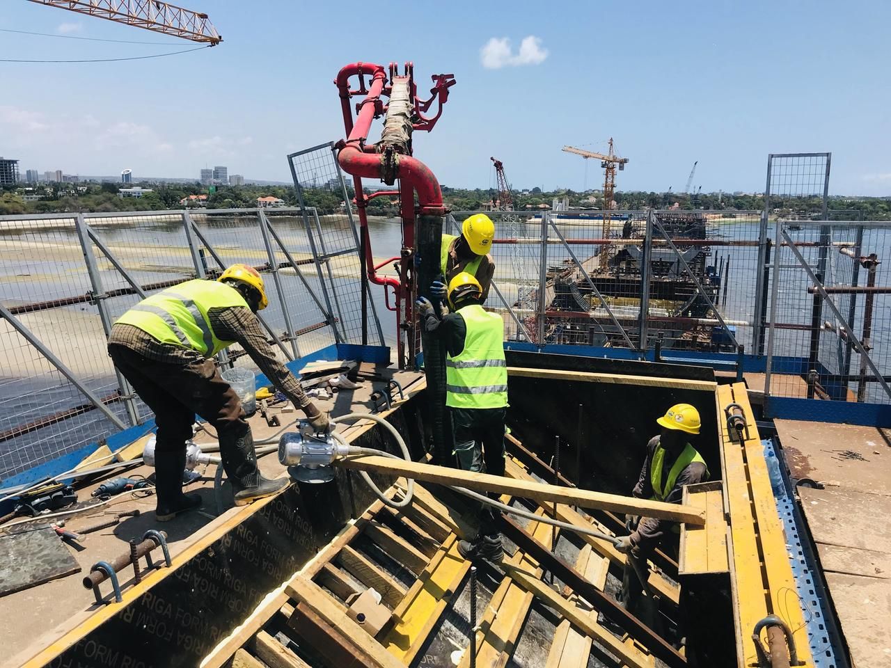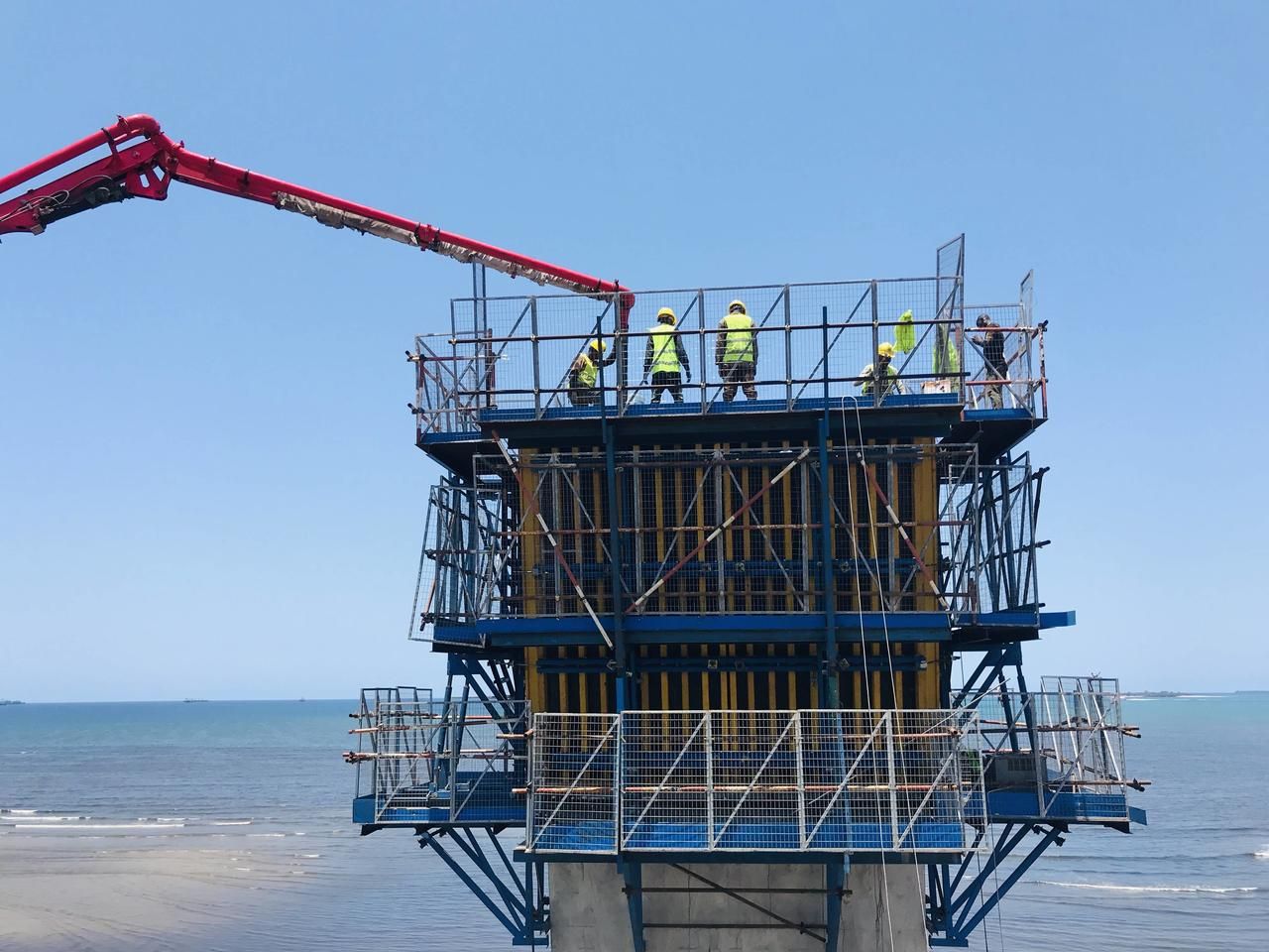 坦桑时间10月10日15时30分,随着最后一车混凝土入模,由中铁云顶国际承建的坦桑尼亚新塞兰德跨海大桥P5主墩塔顺利封顶,至此P5主墩混凝土主梁进入快速悬浇施工阶段。