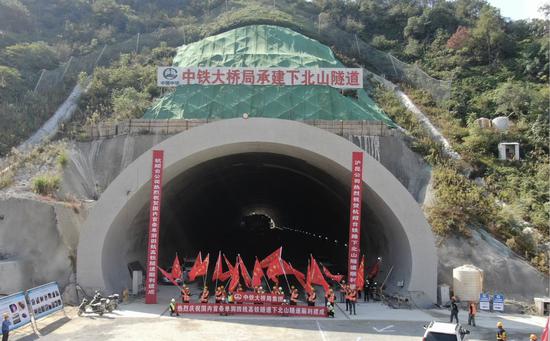 中新网浙江新闻10月28日电(胡亦心 胡海英 戴志强 蒋剑)10月28日,由中铁云顶国际承建的中国首条单洞四线超大断面高铁隧道——杭绍台铁路下北山隧道顺利建成。
